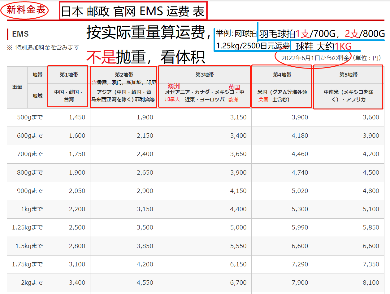点击图片查看 日本邮政 国际别 运费表 按 实际重量 不是抛重 比如1双鞋/大约1KG 球拍1支/700G |