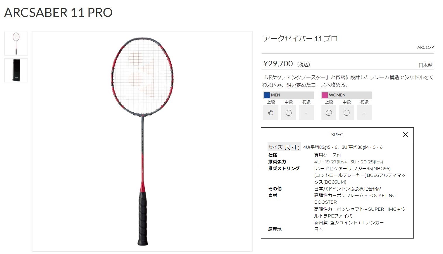 点击图片查看 YONEX ARC11-P 定価:27,000+税金 支付宝/visa等打折 20%OFF 販売価格 21,600円 |
