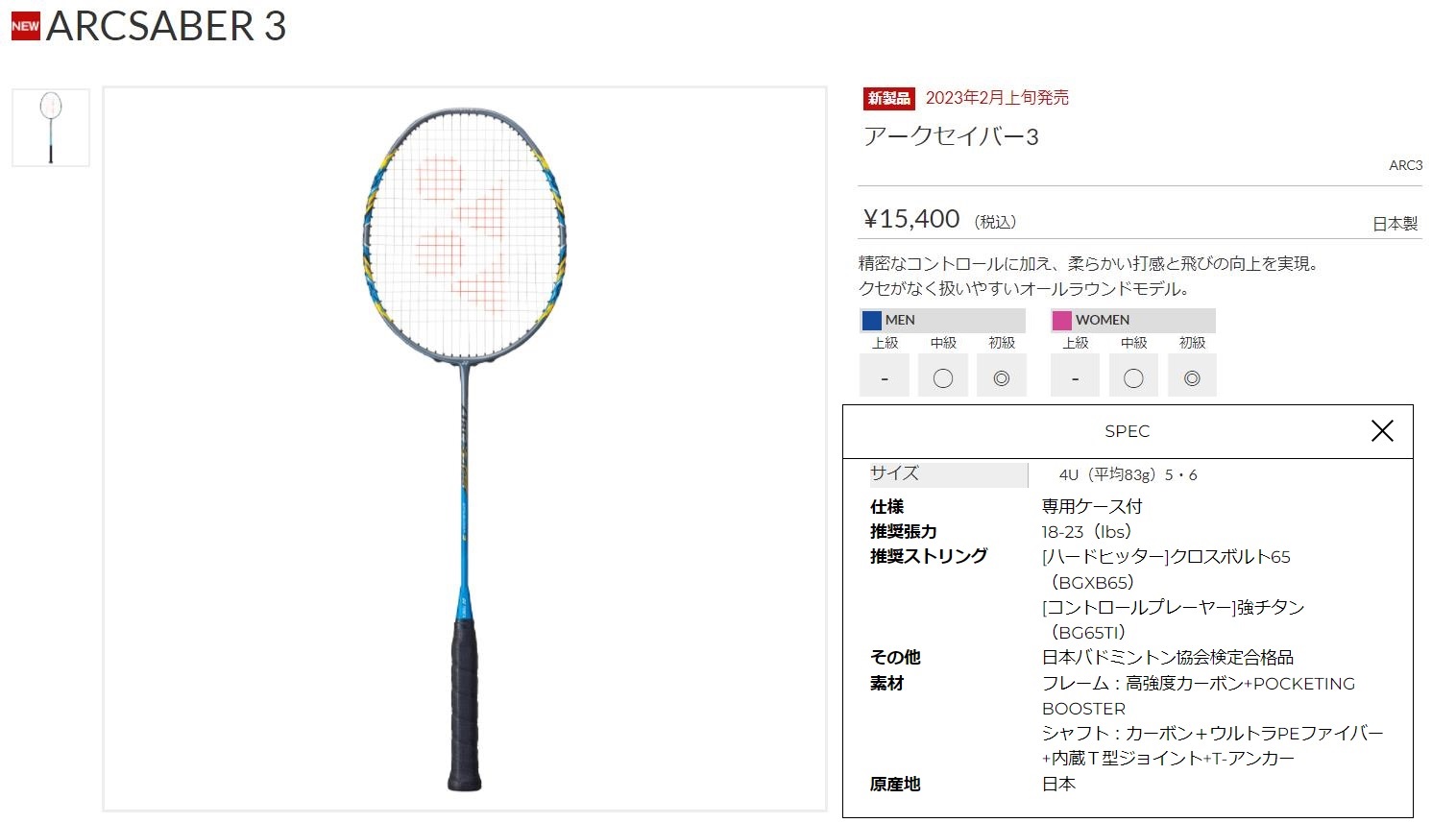 点击图片查看 YONEX ARC3 定価:14,000+税金 支付宝/visa等打折 20%OFF 販売価格 11,200円 |