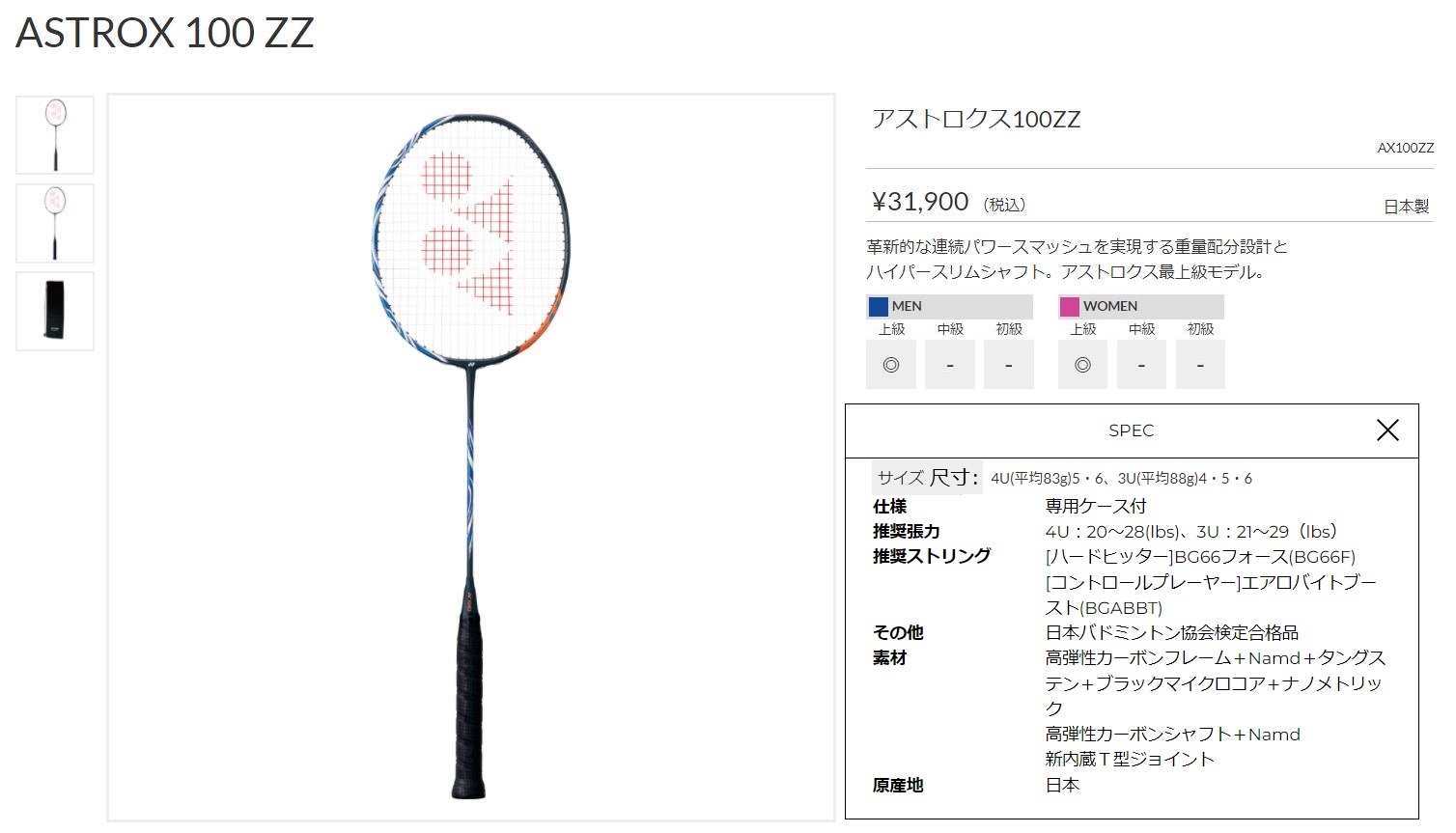 | 点击图片查看 YONEX NewAX100ZZ 定価:29,000円+税金 支付宝/visa等打折 20%OFF 販売価格 23,200円 |