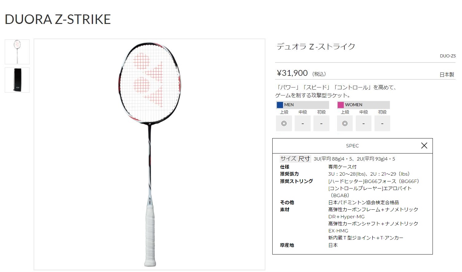 点击图片查看 YONEX DUO-ZS 定価:29,000円+税金 支付宝/visa等打折 20%OFF 販売価格 23,200円 |