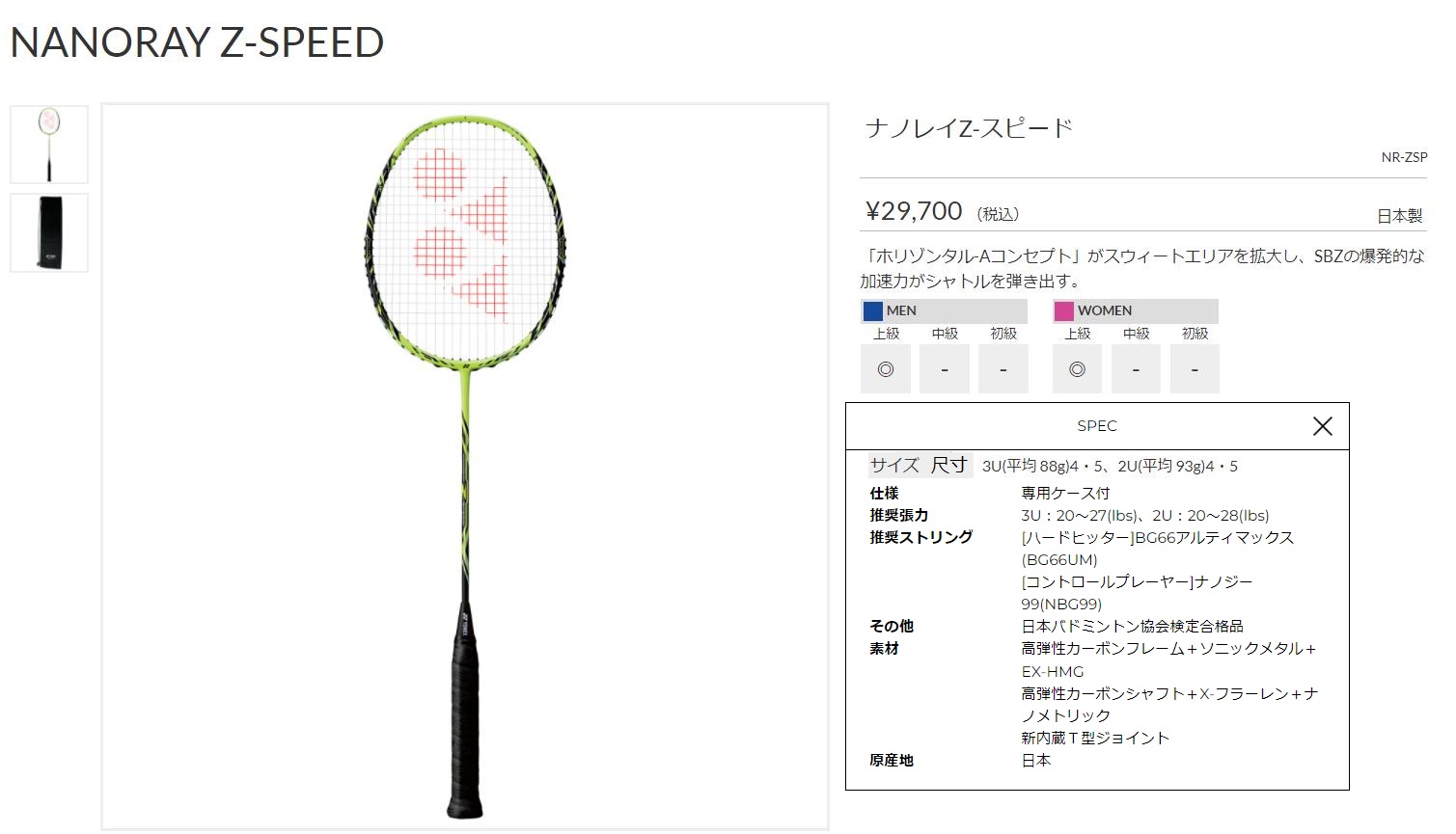 点击图片查看 YONEX NR-ZSP 定価:27,000円+税金 支付宝/visa等打折 20%OFF 販売価格 21,600円 |
