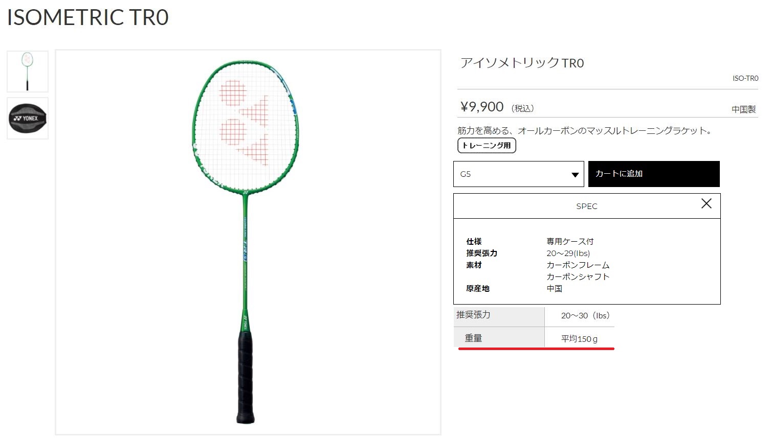 点击图片查看 YONEX 训练球拍 150G ISO-TR0 定価:9,000+税金 支付宝/visa等打折 20%OFF 販売価格 7,200円 |